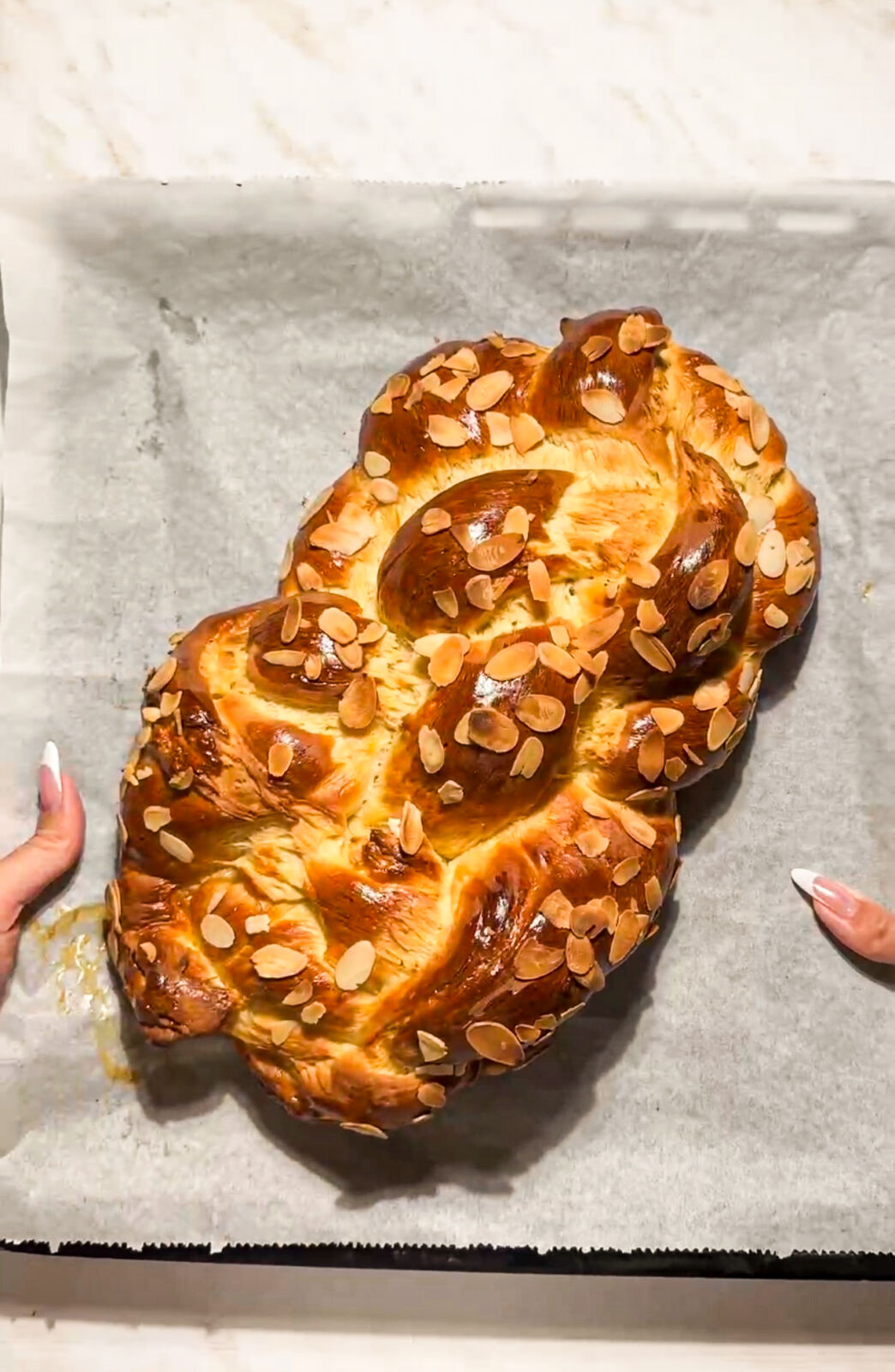 - Položíme na papier na pečenie na veľký plech šikmo a necháme kysnúť 15 minút (šikmo preto, lebo vianočka nakysne a po upečení bude väčšia).